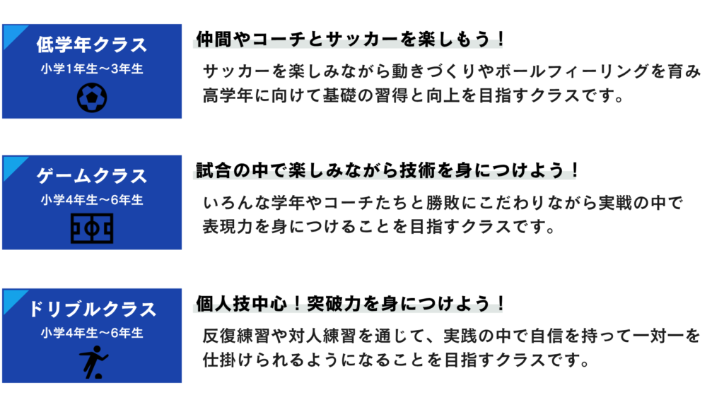 W-up→TR1→TR2→GAMEが基本構成です。自らが考え、プレーできるようになることを第一に行います。クラスによっては試合の主導権を握るための戦略・戦術についても言及します。