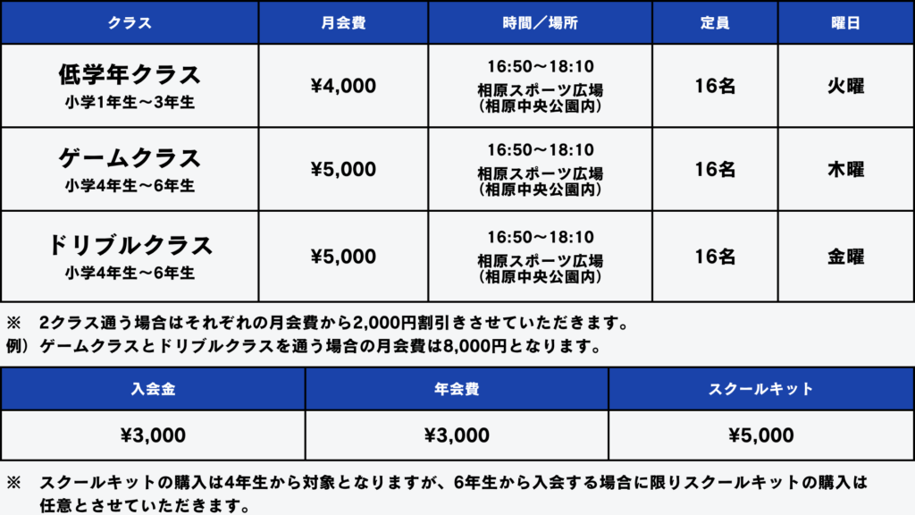 時期により新規入会キャンペーンやジュニアユースに入会する際の入会金の割引および免除を行っております。